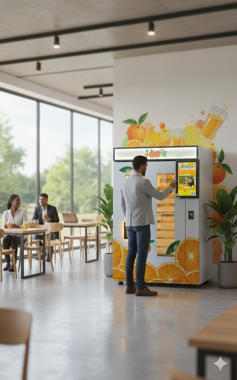 At IJOOSE, we believe that freshness and convenience should go hand in hand. Our smart vending machines are designed to make 100% freshly squeezed orange juice available anytime, anywhere, with just the press of a button. No additives, no preservatives – just pure, natural juice squeezed right in front of you.